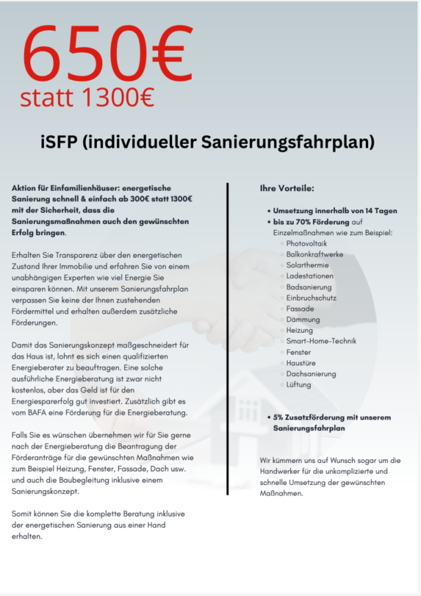 Einzelmaßnahmen, die im iSFP enthalten sind, erhalten einen Förderbonus von +5%. Somit hat dieser sich bereits durch die Umsetzung nur einer empfohlenen Maßnahme bereits bezahlt gemacht.